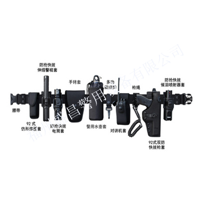 組件名稱:由黑色外腰帶、內(nèi)腰帶、斜肩帶(選配)、手銬套、通用型對(duì)講機(jī)套、防搶快拔電套、多功能掛扣、警用水壺套、防搶快拔警棍套、槍繩、92式雙防快拔槍套(可選配其他型號(hào)的槍套及左手款槍套)、防搶快拔催淚噴射器套、92式仿形彈匣套組成,除對(duì)講機(jī)套之外所有套具均可單獨(dú)拆卸。